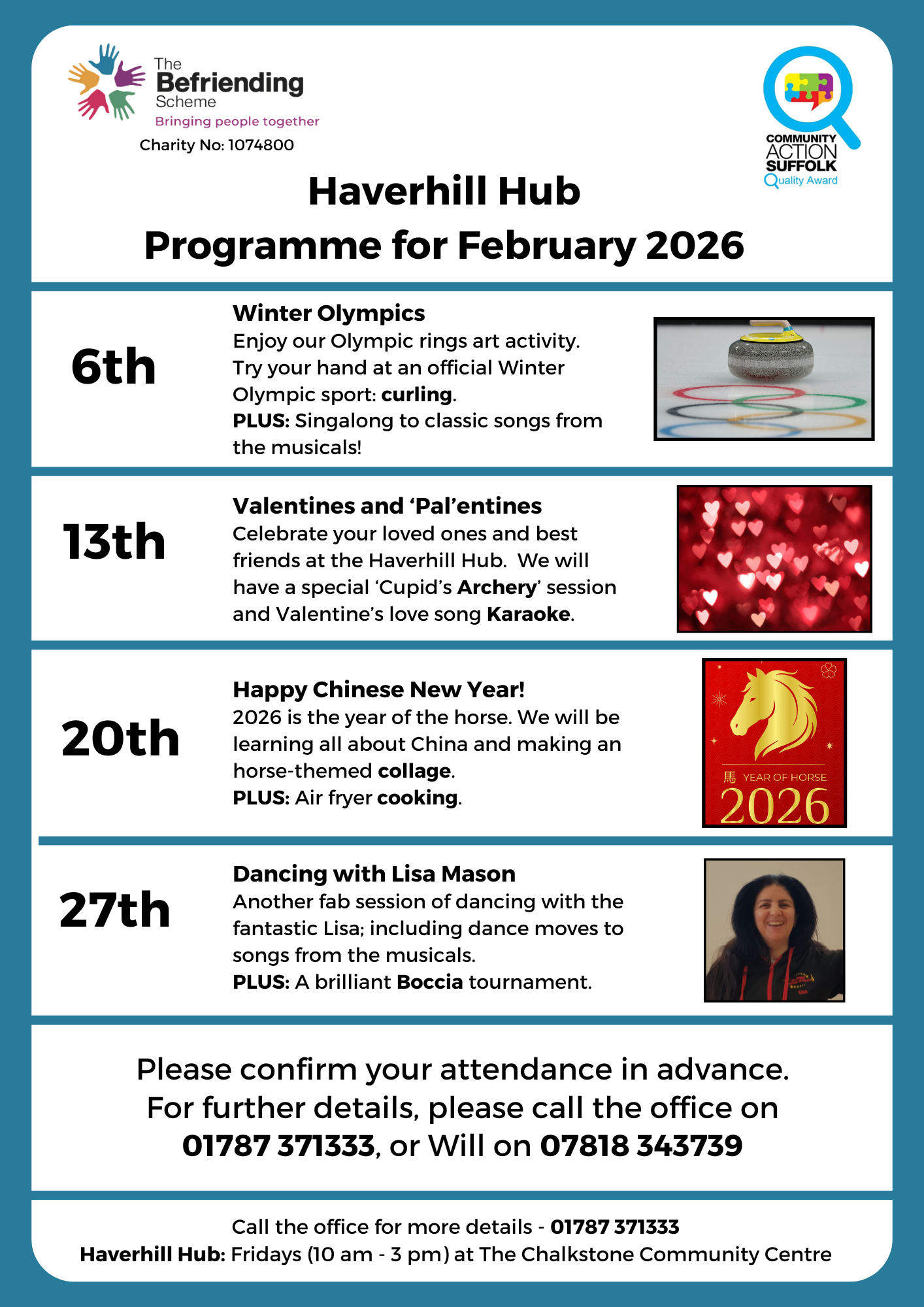 The Befriending Scheme 10 February 2026 Hub Group Programmes (February) The Befriending Scheme 10 February 2026 Find out the activities on offer each week at our groups during FEBRUARY below... Coffee, Craft and Company (Sudbury) Haverhill Lowestoft If you would like to find out more information about our Hub Groups click the link below… Hub Groups